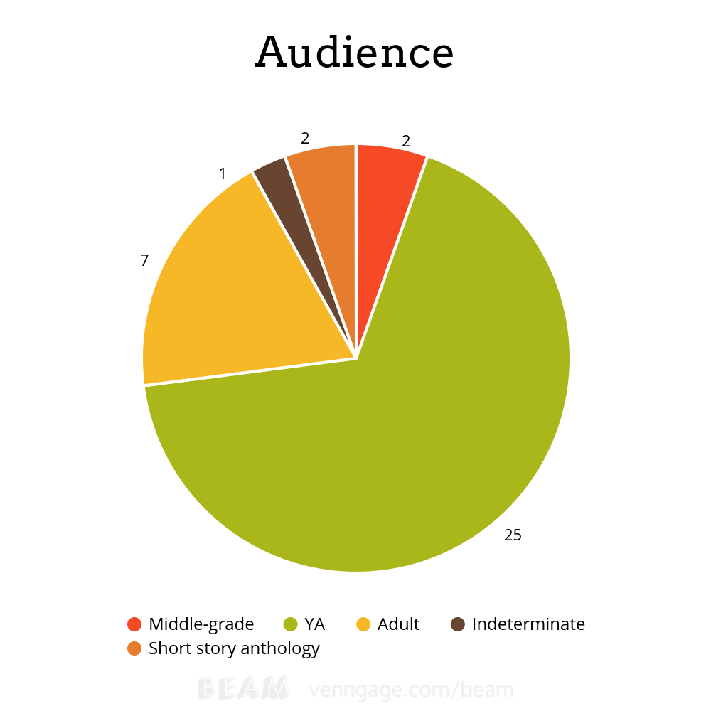 Adult books predictably come in second place. I also read two middle-grade books this year (The House with a Clock in Its Walls, Red Scarf Girl), as well as two short story anthologies. As for the “indeterminate” category? I honestly couldn’t pick where Something Wicked This Way Comes should fall, so I decided it should just be required reading for everybody, no matter how old you are.
